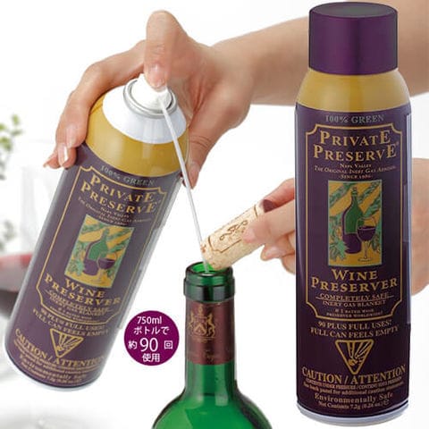| プライベート・プリザーブ(窒素ガス)を飲み残したワインに注入し、ワインの風味や香りの劣化進行を遅らせます。世界中のワイナリーで使用されている生体に安全な不活性ガス(無味無臭)の為、新品でも重さは感じられません。通常750mlボトルで約90回(噴射回数約450回)ご使用頂けます。噴射音がしなくなったら空です。 ※ストロー2本付 素材:窒素ガス75%、炭酸ガス25% |