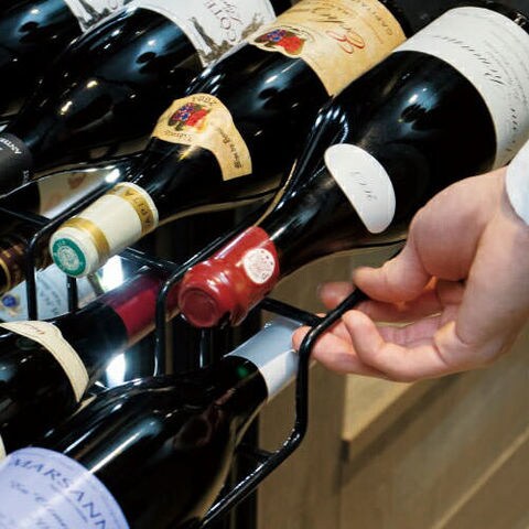 魅せるーディスプレイセラー。特殊な棚とLED照明により斬新な並び方でワインのラベルを美しく引き立たせます。