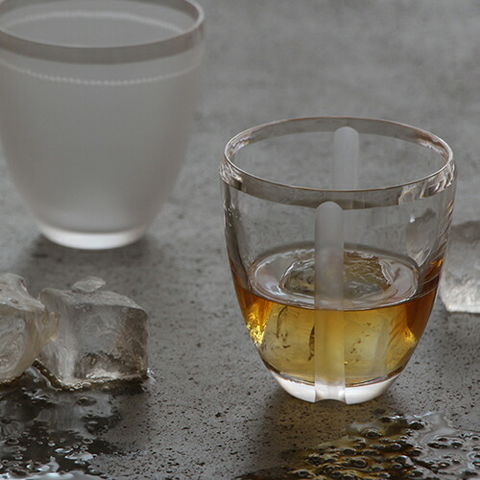 | ずしりと心地よい重みの厚手のグラスに、大胆なデザインのカットが施されています。 |