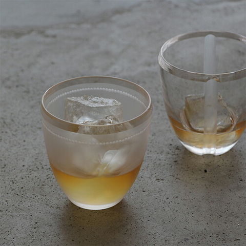 | ずしりと心地よい重みの厚手のグラス。口元はカットと磨きで口当たり良く。表面はサンドブラスト加工の後さらに酸洗いという加工を経て、しっとりとした質感を再現しています。 |