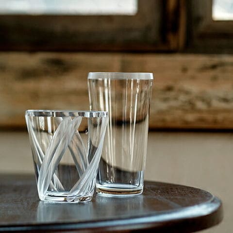 | ずしりと心地よい重みの厚手のグラスに、大胆なデザインのカットが施されています。 |