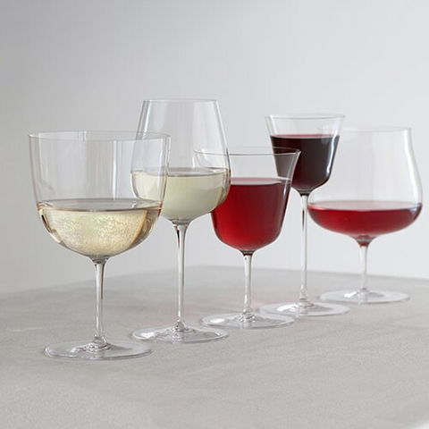 | 全体的に背が低く小ぶりなシリーズ。それぞれの異なる形状は、中身のワインを想定して考えられました。こちらは樽の効いたシャンパンに。 |