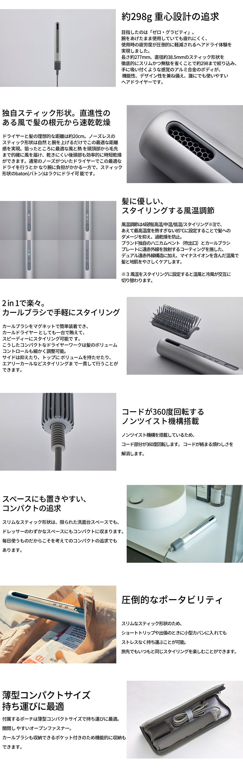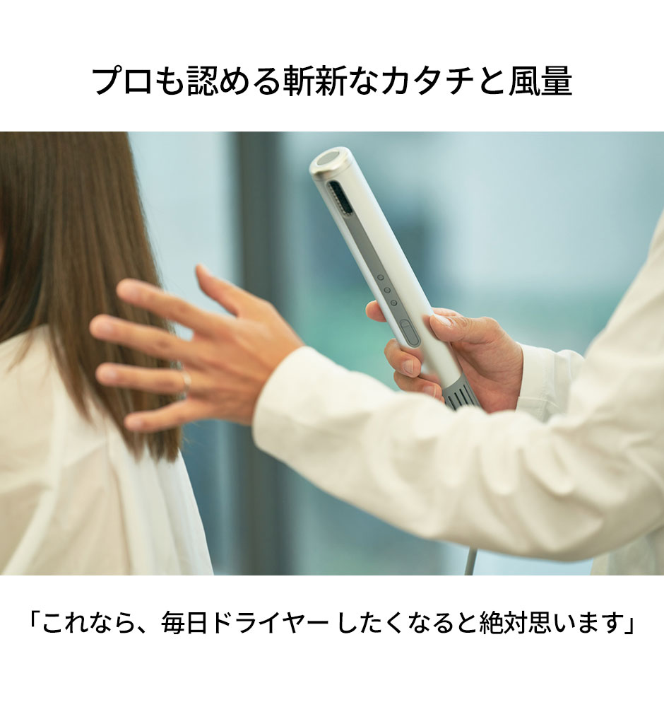 2017年より5年以上の歳月を費やし理想のドライヤーの形を追究した独自の発想のもとに、軽量化と効率的な送風機能の両立を、リレー競技用バトンのサイズで実現しました。