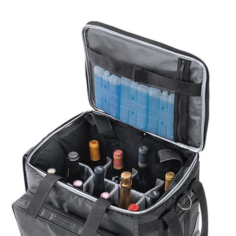 | 750mlのワインボトルや四合瓶なら12本、シャンパンボトルなら9本収納。 保冷剤ポケット付きなので試飲サンプルの運搬用にも活躍してくれます。また、飛行機の旅にも最適。12本入れた状態で無料預け手荷物の重量 制限 (通常:23kg) 以内に収まる設計です。使わない時は折りたたんで厚さたったの20センチに。行きはスーツケースに入れて、帰りは“想い出”を入れて持ち帰りましょう。保冷剤ポケット付きなので仕切りを外せはばBBQのクーラーバッグとしても活用できます。ショルダーストラップもついているので、階段などでは肩にかけて持ち運ぶことができます。 |