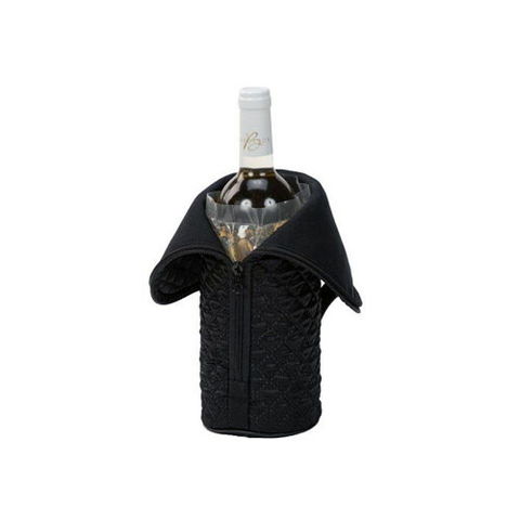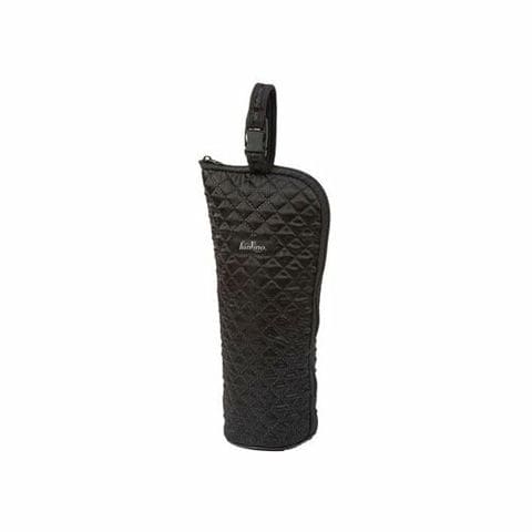 マットブラックのキルティング調生地はシックなデザイン、かつ、適度な厚みがボトルのクッションの役割にも。付属の保冷ジェルを事前に冷蔵庫で冷やしておいてボトルに巻きつければ、持ち運びの間もしっかり保冷できます。