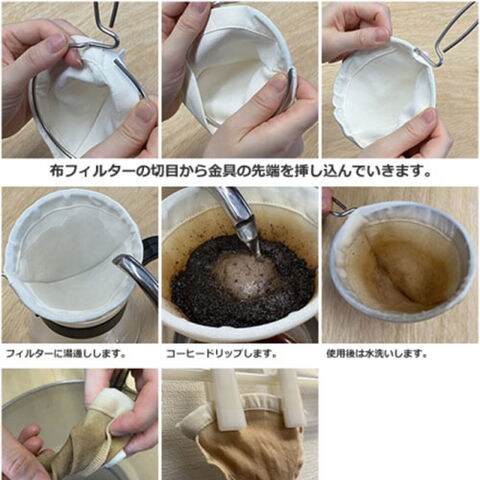 簡単なお手入れで繰り返し使えるコーヒー用布フィルターです。使用後は水で洗って干しておけばOK。面倒な管理をせずに美味しいコーヒーが淹れられます。