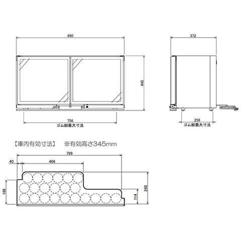 | サイズ:W880×D372×H445 消費電力:90W、LED13W 容量:56L 重量:34kg 冷媒:R600a (ノンフロン) |