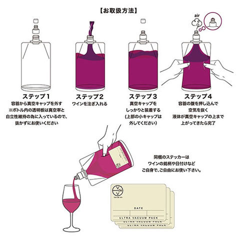 | 特許技術の真空キャップにより容器に入れたワインを真空状態にしてワインの酸化を抑制する事ができる真空ワイン保存パウチ『ヴィドヴァン』 インポーター様や飲食店様用に『業務用』もご用意 重たい瓶を数本持参せずにワインをヴィドヴァンに入れ替えて、多くの種類のワインを持ち運ぶ事も可能になります。 さらに瓶よりも省スペースで冷蔵庫等に保管することも可能 同封のステッカーはワインの銘柄や日付けなどの記入にとても便利です。 ワインはもちろん、アイスコーヒーやオリーブオイル、ワインビネガーなどの液体調味料にもご使用いただけます。 |