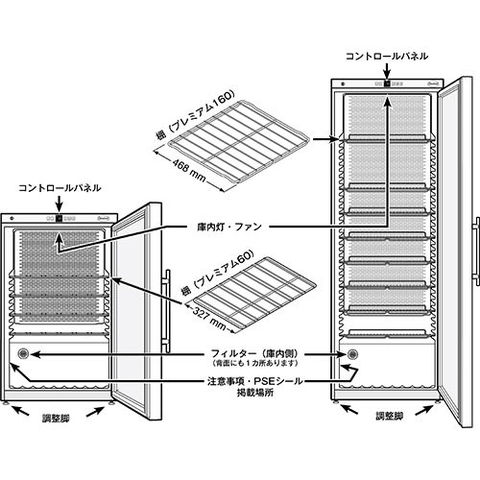 | 本体内寸:幅510×奥行600(最下部420)×高さ1470 設定可能温度:7℃~20℃ 定格消費電力:200w 年間消費電力量:168kw/年 冷却方式:コンプレッサー式 電源コード:1.9m 庫内灯:白色LEDインテリアライト 付属品:ラック×8、鍵 |