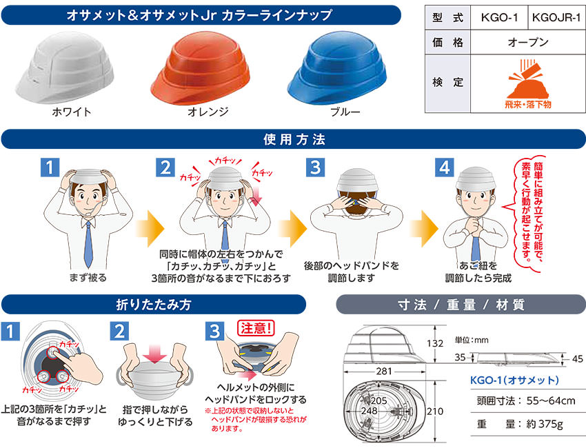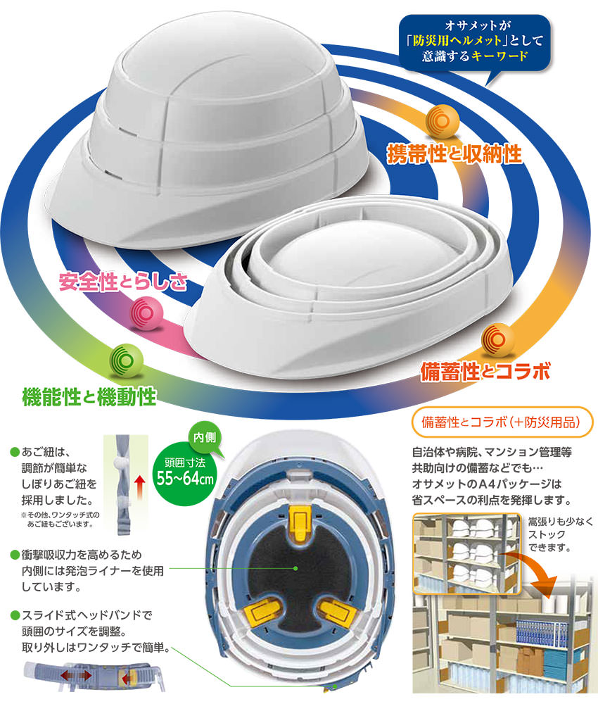 | ※オサメットは「防災用」ヘルメットです。「作業用」や「オートバイ・自転車用」としてご使用しないでください。 |