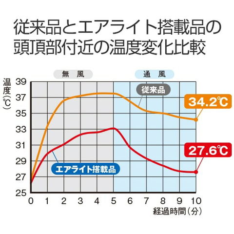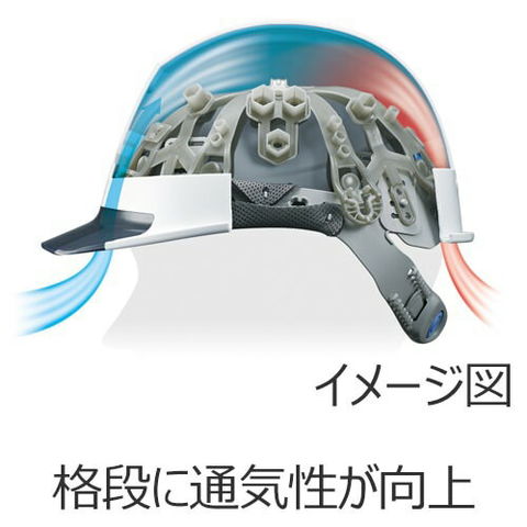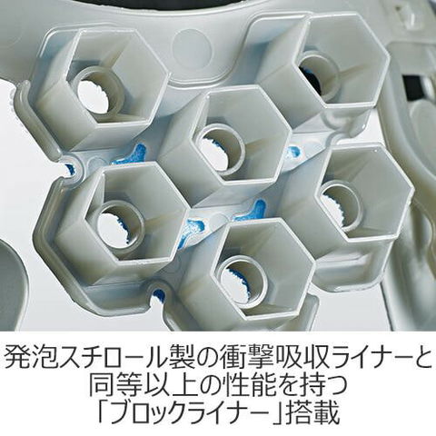 | 発泡スチロール製の衝撃吸収ライナーがないヘルメットで墜落時保護用の検定を取得 ヘルメット内部に空間が広がり、格段に通気性が向上 発泡スチロール製の衝撃吸収ライナーと同等以上の性能を持つ「ブロックライナー」搭載 |