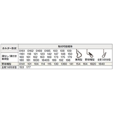 | ・溝なし/溝付き兼用型:0161、0162、0169、0185、103、108、109、1161、118、121、123、142、147、148、150、160、161、162、163、169、173、175、179、180、181、1830、1840S、189、192、198 ・野球帽型:0141、101、104、114、115、130、1360、141、154、164、1820、1840 ・全周つば付き型:153、177 |