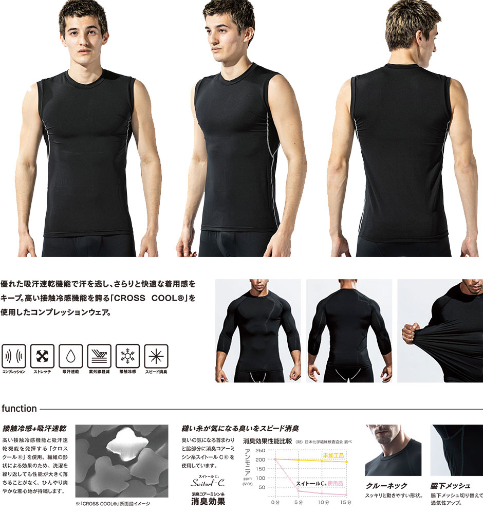 腕周りをスッキリ動きやすく、スピード消臭でさわやか快適、吸汗速乾に加え両脇メッシュでさらさらクール!