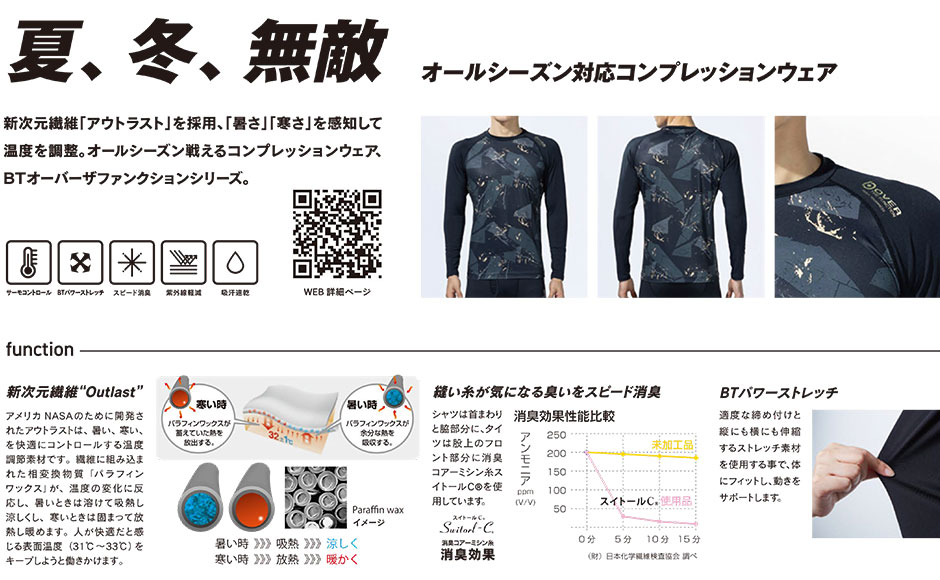 | サーモコントロール、BTパワーストレッチ、紫外線軽減、スピード消臭、吸汗速乾 | ||||||||||||||||||