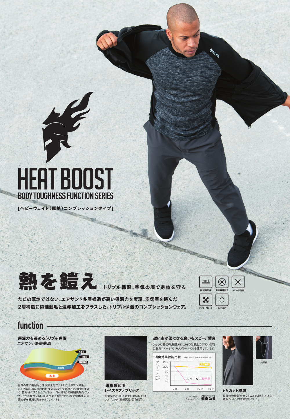 | 微細裏起毛・遠赤外線加工・スピード消臭・BTパワーストレッチ・吸汗速乾・トリカット縫製・トリプル保温・コンプレッション性 | ||||||||||||||||||