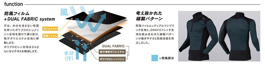 | ハイネックタイプ、防風機能と動きやすさを考慮した縫製パターン、防風フィルム+DUAL FABRIC system |