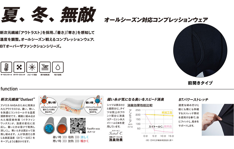 | サーモコントロール、BTパワーストレッチ、スピード消臭、紫外線軽減、吸汗速乾 |