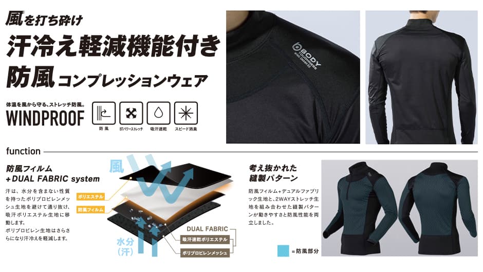 | 防風、BTパワーストレッチ、吸汗速乾、スピード消臭 |