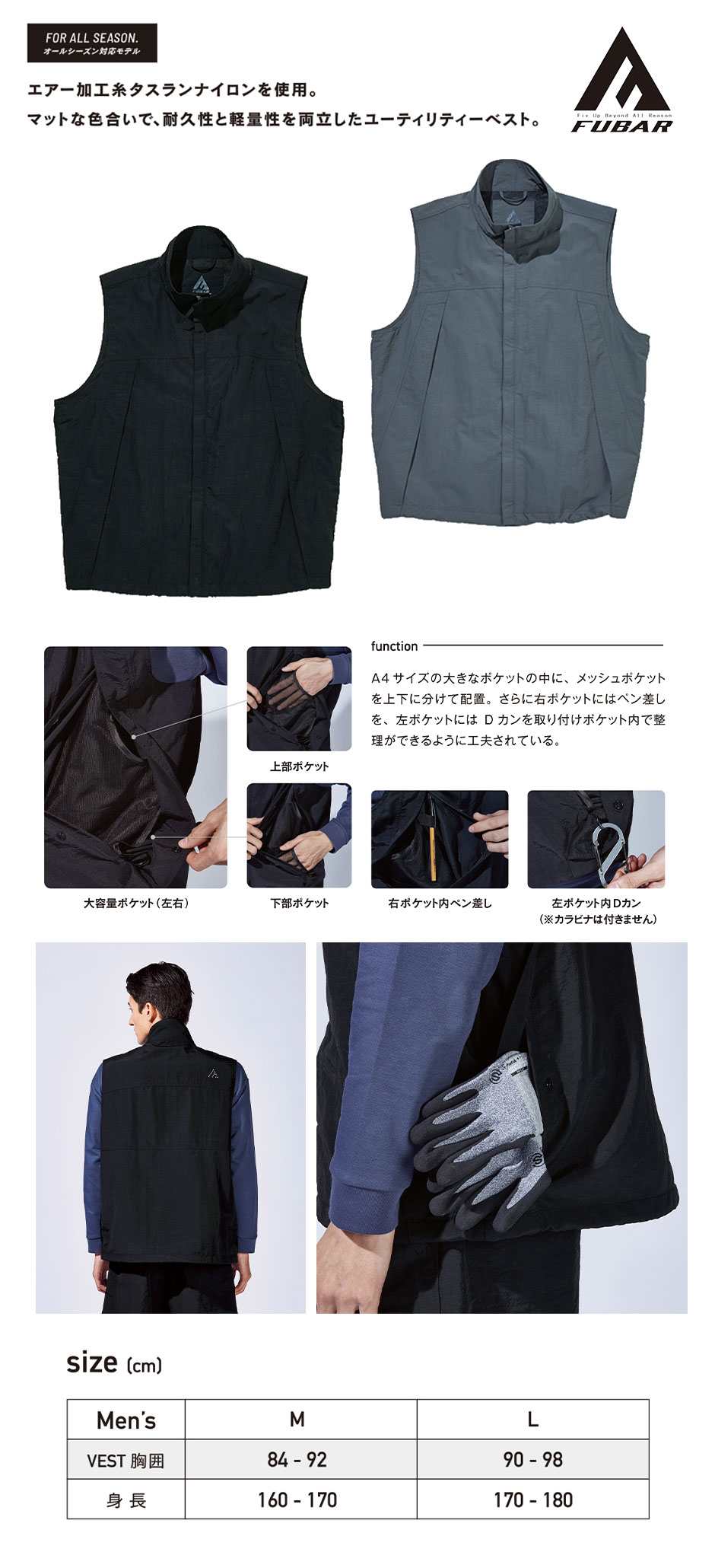 エアー加工糸タスランナイロンを使用。マットな色合いで耐久性と軽量性を両立したユーティリティーベスト。