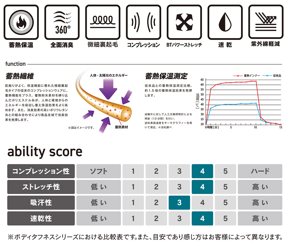 | ●蓄熱繊維 蓄熱粉末素材を練りこんだポリエステル糸が人体と環境からのエネルギーを吸収し蓄え保温効果をより高めます。 また、消臭効果の高いポリウレタン糸との組み合わせにより商品全域で消臭効果を発揮します。 ●蓄熱保温 従来品と比較して約1.5倍の蓄熱保温効果を発揮します。 |
