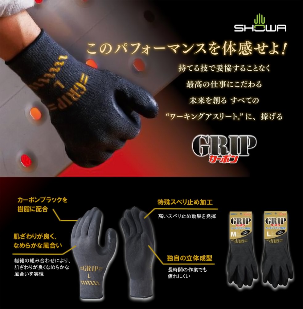 SHOWA ショーワグローブ グリップカーボン(タグ付) 10双 318 背抜き手袋 天然ゴムコーティング
