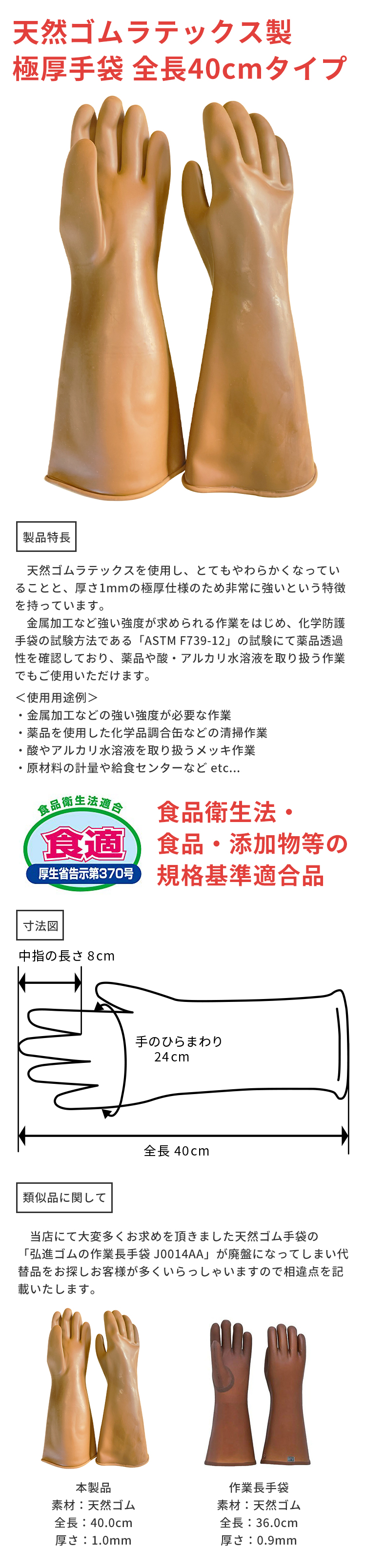 | 寸法:全長(cm)約40・手のひらまわり(cm)約24・中指の長さ約8cm 厚み:指先(mm)約1.10・手のひら(mm)約1.00 物性:伸び(%)550以上・引張強さ(Mpa)15.0以上 |