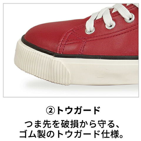 | ■耐滑ソール 滑りにくさを考慮した靴底デザインで耐滑世アップ。(JIS規格相当) ■トウガード つま先を破損から守るゴム製のトウガード仕様。 ■鉄製先芯入り つま先を保護するために鉄製先芯を使用。 ■ムレにくい サイドにベンチレーションを採用することで、ムレを解消し、快適な履き心地。 |