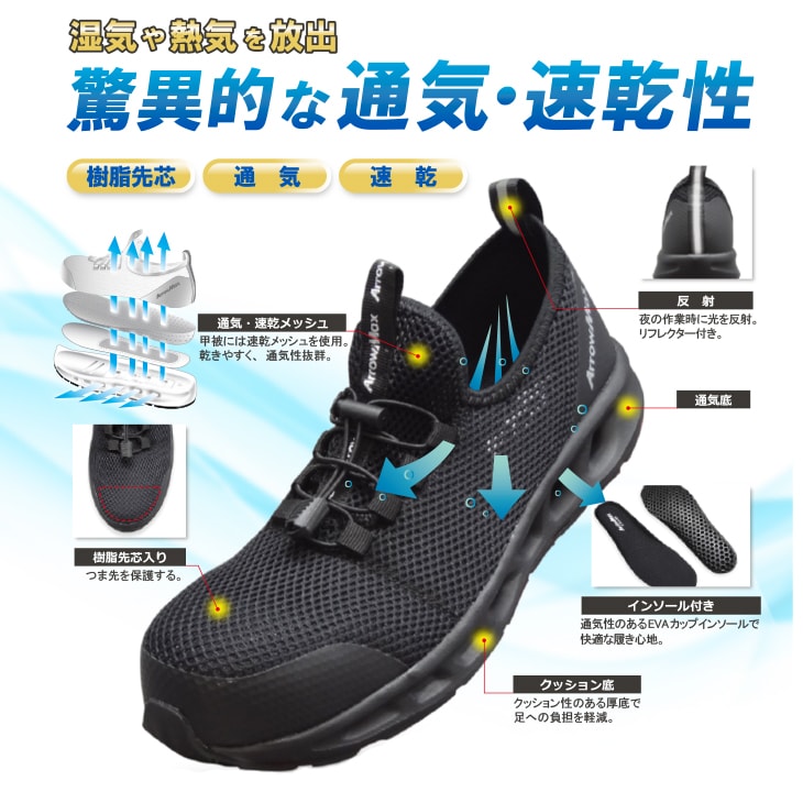 | ■通気・速乾メッシュ 甲被には速乾メッシュを使用。乾きやすく、通気性抜群。 ■樹脂先芯入り つま先を保護する。 ■反射 夜の作業時に光を反射。リフレクター付き。 ■インソール付き 通気性のあるEVAカップインソールで快適な履き心地。 ■クッション底 クッション性のある厚底で足への負担を軽減。 |