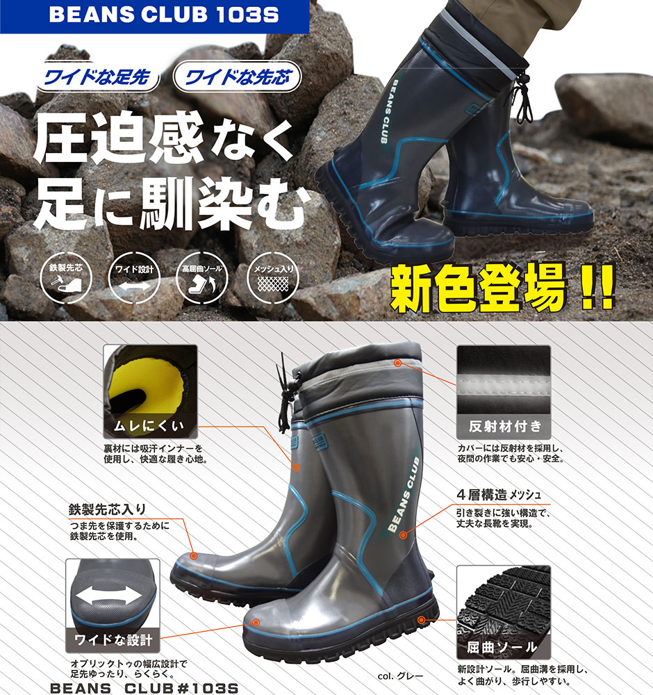 安全長靴 福山ゴム BEANS CLUB ビーンズクラブ(先芯入) #103-S AA812 レインブーツ 鉄製先芯 ワイド 高屈曲ソール 反射材 フード付き 吸汗インナー