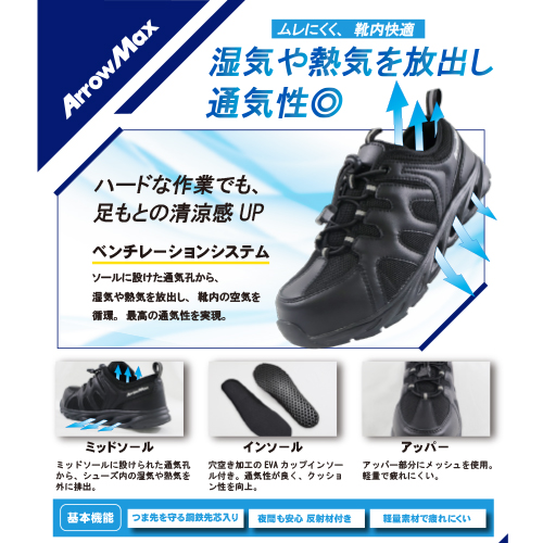 | 基本機能 ハードな作業でも、足もとの清涼感 UP ベンチレーションシステム ソールに設けた通気孔から、湿気や熱気を放出し、 靴内の空気を循環。 最高の通気性を実現。 ミッドソール ミッドソールに設けられた通気孔から、シューズ内の湿気や熱気を外に排出。 インソール 穴空き加工の EVA カップインソール付き。通気性が良く、クッション性を向上。 アッパー アッパー部分にメッシュを使用。軽量で疲れにくい。 |