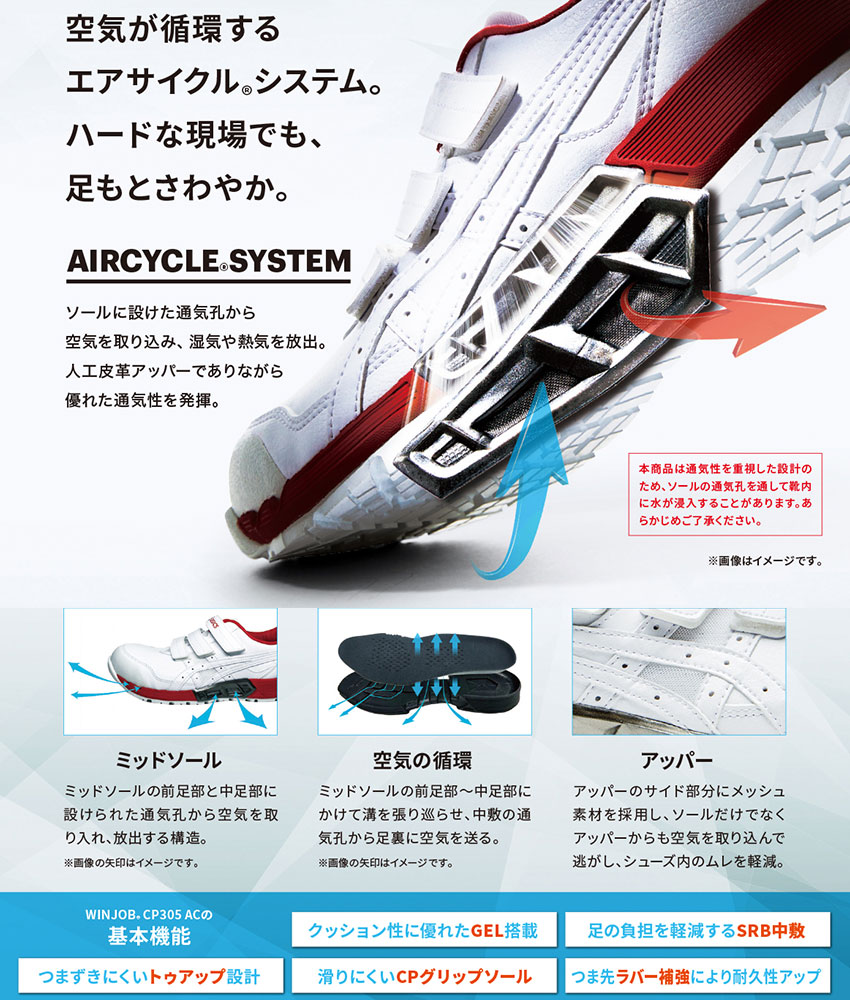 | ◆歩行動作に合わせて足裏に空気を取り込む特殊ソール構造のローカットベルトタイプ ◆エアサイクルシステム SYSTEM01吸気:ミッドソールの前足部と中足部に設けられた通気孔から空気を取り入れる特殊構造。 SYSTEM02循環:ミッドソールの前足部~中足部にかけて溝を張り巡らせ中敷の通気孔から足裏に空気を送ります。 SYSTEM03放出:アッパーにメッシュ素材を採用しソールだけでなくアッパーからも空気を取り込みシューズ内のムレを軽減します。 ◆fuzeGEL(フューズ・ゲル) ミッドソールと「GEL(ゲル)」の材料設計技術を融合させた軽量フォームタイプのGEL。もっとも体重のかかりやすいかかと部に搭載し足への衝撃をやわらげて負担を軽減します。 ◆CPグリップソール 耐滑性、耐油性に優れた「CPグリップソール」でパフォーマンスアップ。油で劣化しにくい耐油性ラバーを使用しています。 ◆SRB中敷 足への負担を軽減するために足のアーチを支えてかかとの内側への倒れ込みを抑える立体形状のSRB中敷を採用。取り外して洗濯も可能で清潔感を保ちます。 ◆トゥアップ設計 「転倒」の原因のひとつである「つまずき」に対しシューズのつま先をあげることで引っかかりにくくしています。 ◆再帰反射材 夜間や暗部作業にも配慮。かかと部分に再帰反射材採用。 ◆つま先部ラバー補強 ◆耐油性ラバー |