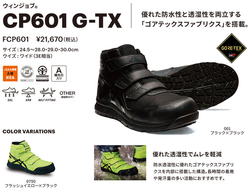 安全靴 ハイカット asics アシックス WINJOB ウィンジョブ CP601 G-TX FCP601 マジックテープ JSAA規格 プロテクティブスニーカー