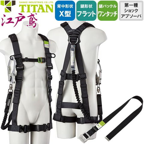 安全帯 タイタン TITAN サンコー フルハーネス シングルランヤード付き 新規格 セット ハーネス 1丁掛け 江戸鳶 ETN-9A-DEB EXJ 胴作業ベルト付き 背中X型 水平 フラット 墜落制止用器具 伸縮式 軽量 一般 高所作業 柱上作業 建設工事