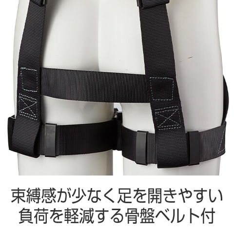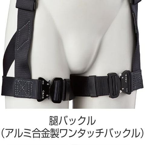 | 肩・腿・骨盤ベルト:幅45mm(ポリエステル) 胸ベルト:幅25mm(ナイロン) 肩バックル:スチール 胸クリップ:ワンタッチ(アルミ合金) D環:スチール 休止フック掛け(2個)、D環固定板、ベルト止め:樹脂 |