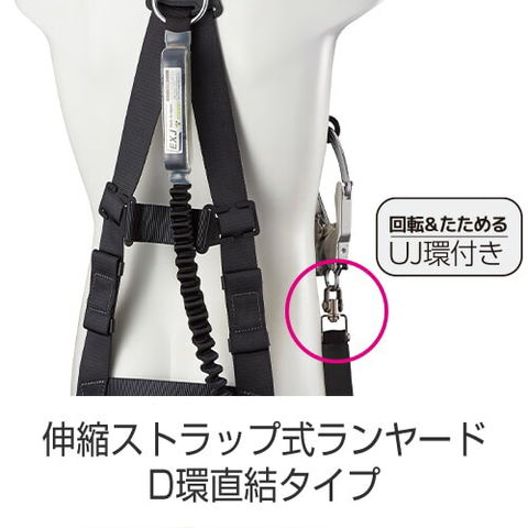 | 伸縮ストラップ式ランヤード D環直結タイプ ストラップ:ゴム芯入りポリエステル被覆(ブラック) 全長約1,600mm(収縮時 約1,100mm)×幅約27mm フック:NO.56A(アルミカバー 軽量タイプ) UJ環付き |