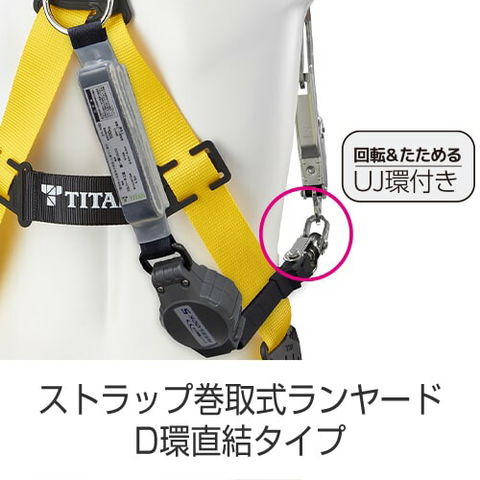 | ストラップ巻取式ランヤード D環直結タイプ 巻取器:樹脂製ケース ストラップ:アラミド芯入りテトロン 全長約1,700mm(収納時730mm)×幅約17mm フック:NO.56A(アルミカバー 軽量タイプ) UJ環付き |