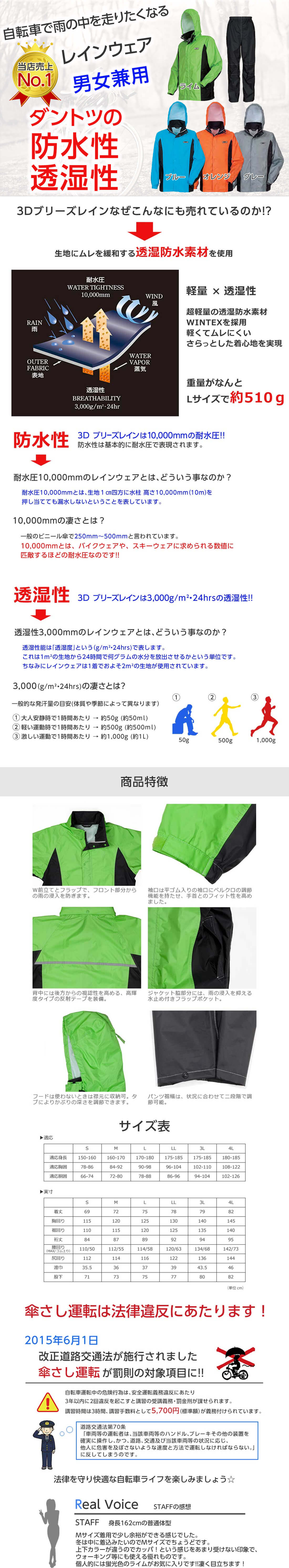 | A:防水 [ウォータープルーフ/防水性/耐水/防水生地/防水テープ/溶着/素材] B:撥水加工 [水をはじく/汚れにくい] C:透湿 [ムレにくい/むれにくい/汗/水蒸気/熱/外へ逃がす/放出] D:メッシュ [ムレにくい/むれにくい/汗/さわやか/爽やか/べたつかない/網目] F:リフレクター [ライト/反射/素材/交通安全/暗闇] H:収納フード [フード/収納] I:袖口調整 [フィット/雨風侵入防止] N:裾調整 [パンツ/フィット/雨風侵入防止] |