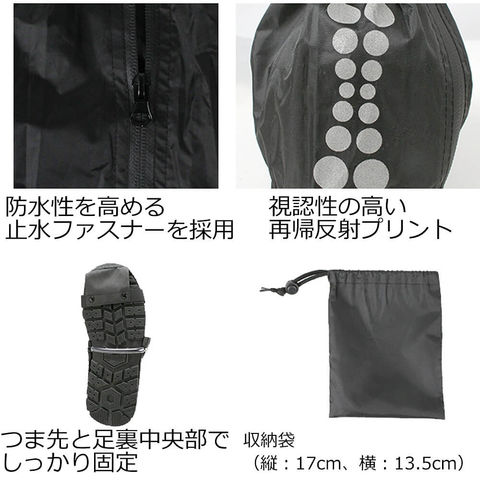 | コンパクトに収納できるレインシューズカバー/フィット感を高め、バタツキを抑える足首ベルト付き/ずり下がりを抑える滑り止め付き/防水性の高い止水ファスナーを採用/視認性の高い再帰反射プリント/収納袋付き |