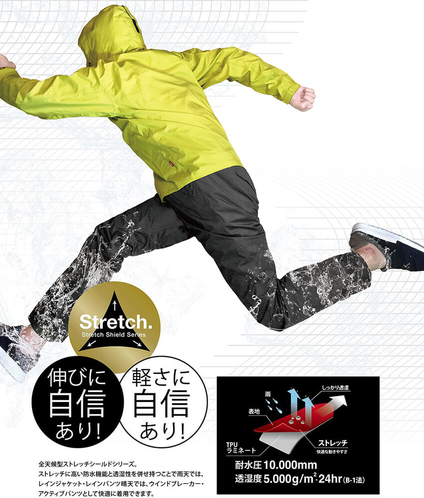 ストレッチに高い防水機能と透湿製を併せ持つことで、雨天ではレインジャケット、晴天ではウインドブレーカーとして、日常から作業まで、場所を選ばず快適に着用できます