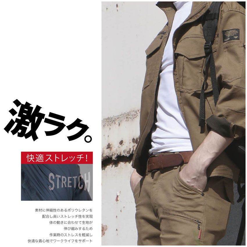| ・伸縮性があり動きやすく作業効率があがる、生地が伸びる、しゃがむことが多い現場に最適です。 |