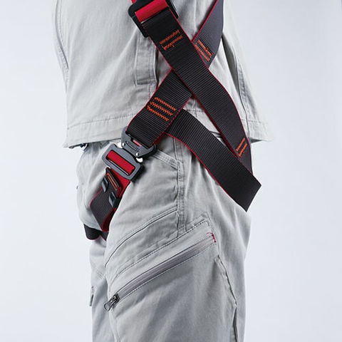 安全骨盤・足回りにベルトが配置されており、落下時に衝撃荷重を分散する上、ベルトがお尻を包み込むので救助までの持久時間が向上。