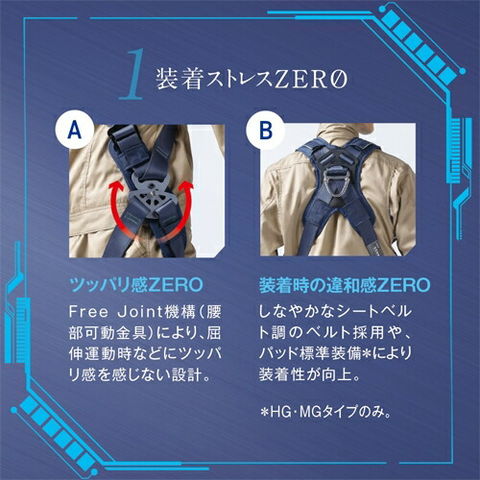 | ※労働安全衛生法の改正により、6.75m(建設業は5m)以上の高さでの作業時には墜落制止用器具(安全帯)の着用が義務化されました。 使用期限(交換時期)や買い替えの基準、廃棄基準についてメーカーの情報にしたがって正しくお使いください。 無重力のような着心地を実現!3つのZEROを可能にした新たなフラッグシップモデル! 1.装着ストレスZERO Free Joint機構(腰部可動金具)により、屈伸運動時のツッパリ感がなくなっただけでなく、しなやかなシートベルト調のベルト採用・パッド標準装備により、装着性が向上しました。 2.ベルトのゆるみZERO 固定機能付ベルト通しにより、継続使用時のベルトのゆるみが軽減されます。また、余長止め具を採用したことにより、作業時における胸部ベルトの垂れ下がりを防止できる安心設計です。 3.無駄スペースZERO 別売りのマルチツールホルダーを使えば、腰回りの無駄スペースを利用して工具袋などをつけることも可能(取付部幅64mm以下のアイテムに対応)。また、背当てパッドにフックハンガーを装備しているので、別途にフックハンガーをベルトに装着する必要もありません。 |