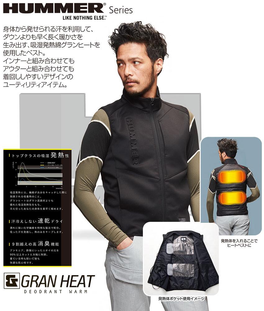 電熱ウェア HUMMER ハマー グランヒートベスト【バッテリー別売】 90730 作業着 防寒 作業服 発熱体ポケット 背面発熱綿 速乾 消臭