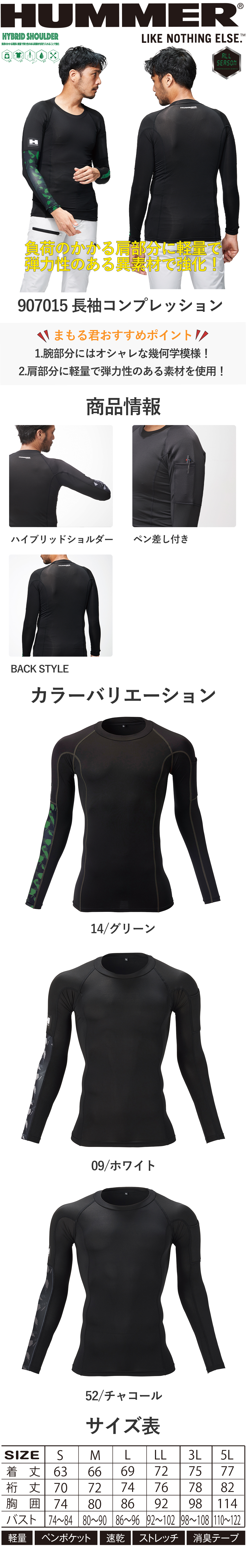 作業着 インナー 長袖 メンズ HUMMER ハマー 長袖コンプレッション コンプレッションインナー 消臭 速乾 ストレッチ ペン差し ペンポケット かっこいい 汗 大きいサイズ