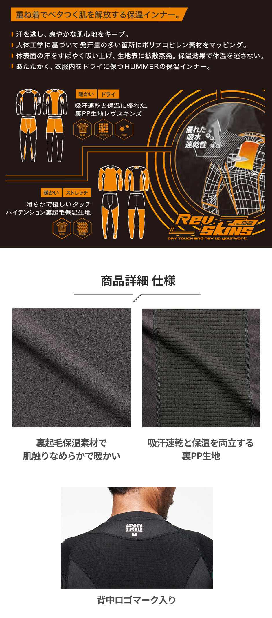 肌面から瞬時に汗を吸い上げるレヴスキングを発汗量の多い背中に集中して配置した着心地の良い保温インナー