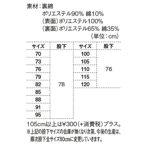 | ※画像サイズ表に記載している股下サイズの製品在庫がなくなり次第、今後の生産製品は、順次全サイズ股下80cmとなり、品番の末に[E]の文字が入ります。 |