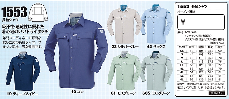 ジーベック 長袖シャツ 作業着 通年 メンズ レディース 吸汗 速乾 ドライタッチ 帯電防止 リサイクル エコ SDGs クレスタ21長袖シャツ 作業服 作業シャツ ワーク マン おしゃれ 人気 安い 大きいサイズ 1570シリーズ XEBEC 1553