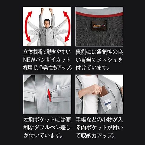 丈夫な綿100%のツイル生地を使用。NEWバンザイカットを採用して動きやすいブルゾンに、2タイプのスラックスをラインナップ。オーソドックスなシンプルデザインの中に、火熱を扱うタフでハードな現場に対応する機能と工夫を凝縮させています。