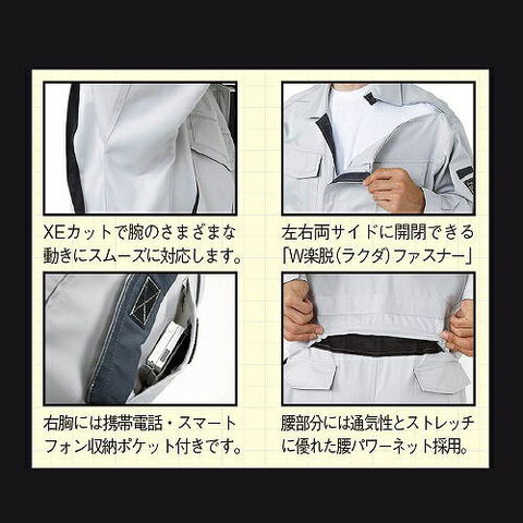 表面からボタンやファスナーの凹凸を抑えたフラット仕様に、動きやすさをサポートするXEカット、さらに両肩に開放できるW楽脱(ラクダ)ファスナーの採用で着脱がよりスムーズに。動きやすさと着心地のよさ、着脱のラクさを併せ持つフィット性が魅力です。