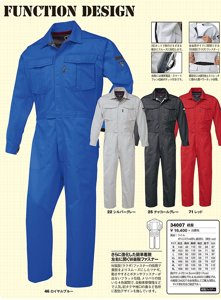 ジーベック XEBEC 34007 カラー続服(ツナギ) 青 赤 通年 秋冬用 メンズ レディース 男女兼用 作業服 作業着 サロペット つなぎ 定番